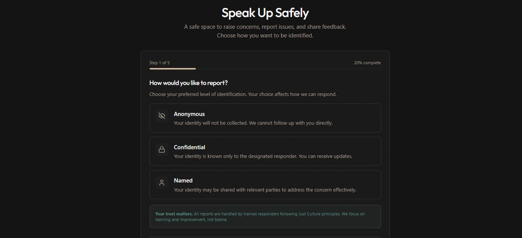 The Anonymous Reporting tool allows people to raise concerns, near-misses, or issues safely and confidentially. Built on Just Culture principles, it encourages honest reporting while protecting individuals from identification or retaliation. For organisations, it shifts reporting from fear-based compliance to meaningful ins