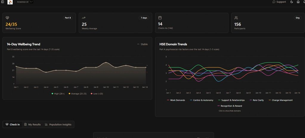 The Individual Check-In gives employees a quick, non-intrusive way to reflect on how work is affecting them right now. Using short, carefully designed questions, it captures patterns of pressure, support, control, and recovery — without identifying individuals or storing personal data. For organisations, this provides early, ethi
