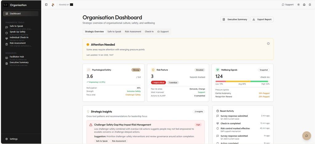 The Executive Overview brings together high-level insights from across Vox Animae tools, giving leaders visibility of cultural and psychosocial trends within their area of responsibility. It provides assurance without exposing individual data, helping leaders make informed decisions while maintaining ethical boundaries and trust.