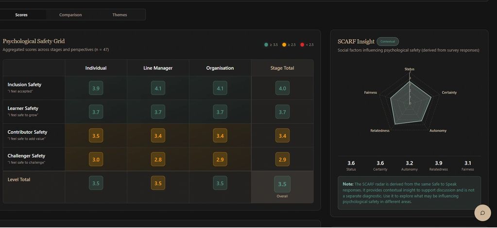 Safe to Speak measures psychological safety across individuals, leaders, and the organisation as a whole. It helps organisations understand whether people feel included, able to learn, confident to contribute, and safe to challenge when something doesn’t feel right. The tool highlights strengths, gaps, and inconsistencies so leade